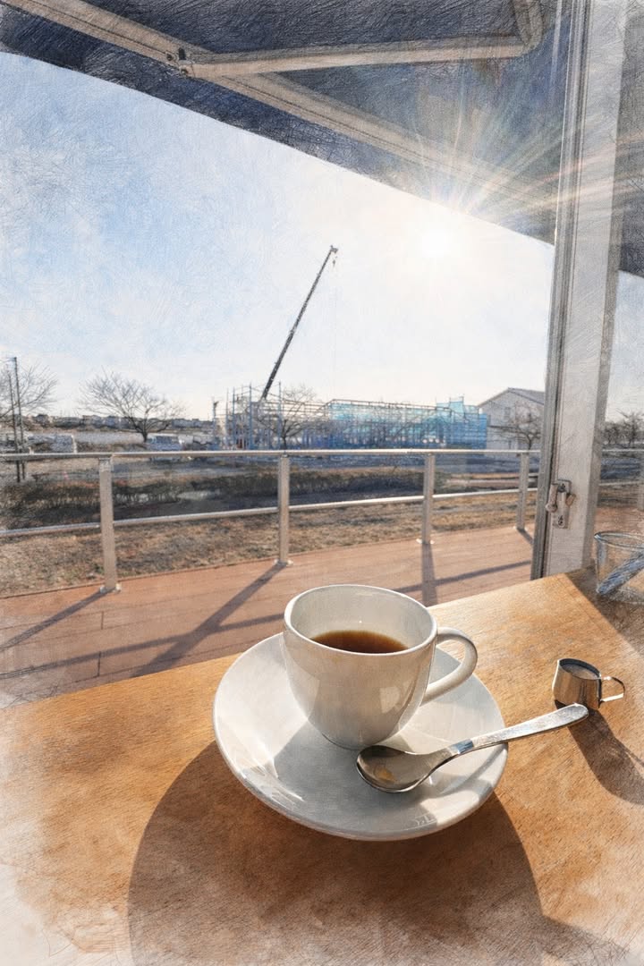 現場近くのカフェでイタリアンロースト珈琲を飲みながら