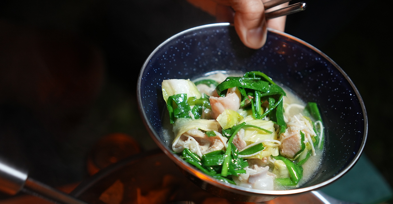 普段は自宅で男メシを作りますが、キャンプメシも妥協はしません。鶏団子で味を変え、博多から取り寄せた麺で締めました。