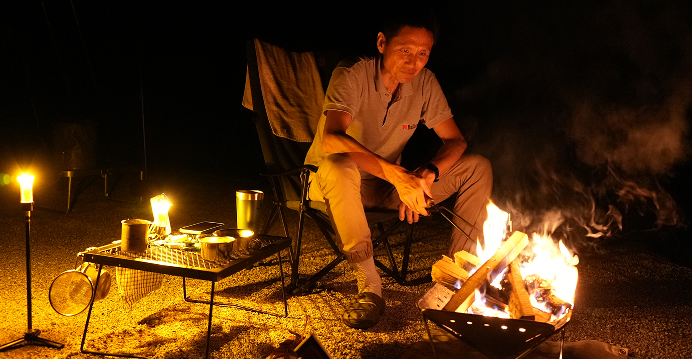 1日の締めは焚き火ですね。火を眺めていると、考えが深まります。
