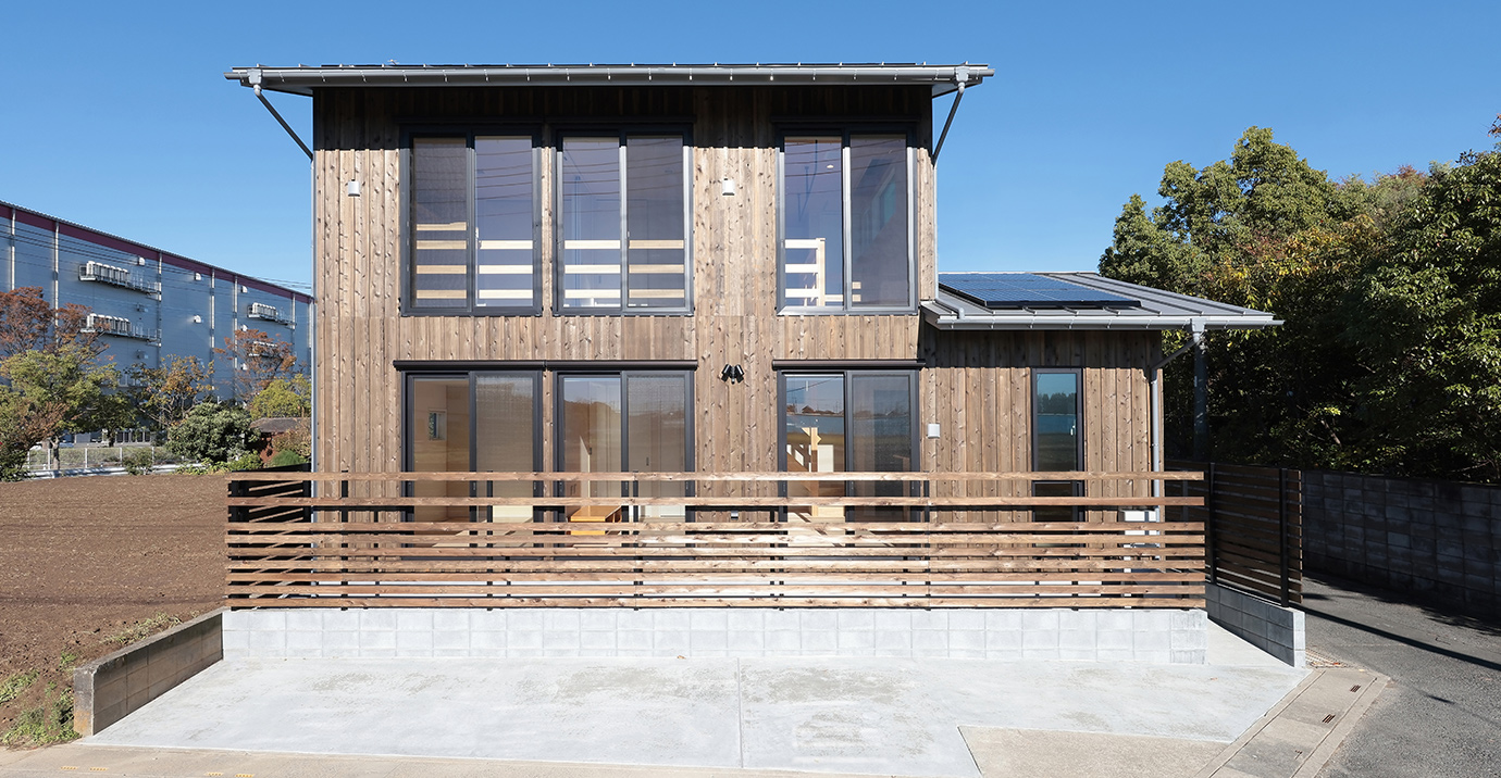今回のお家は敷地面積37坪。杉板張りの外観を持つ、延床面積28坪の「ほぼ平屋」となっております。ちなみに「ほぼ平屋」というのは、「歳を重ねてからは平屋のように使うことができる間取り」という意味で、当社ではこのパターンの家づくりを計画される方がほとんどです。