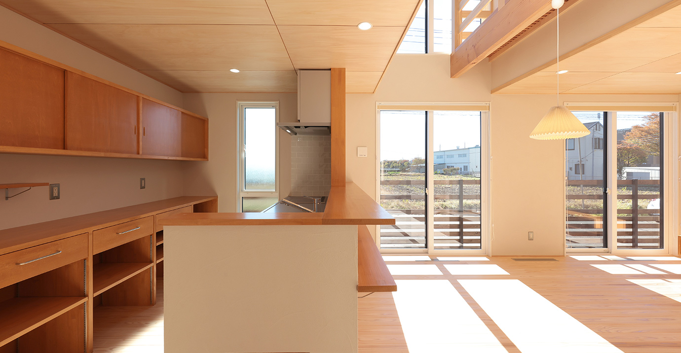 キッチン・食器収納・洗面台はすべて造作。TVボードや書斎コーナーの本箱、及び机も造作でつくりました。もちろん、いつものように高気密高断熱の高性能で暮らしやすい家になっています。